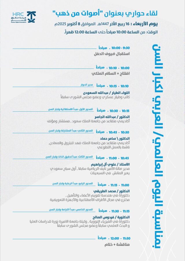 في جلسة حوارية نظمتها هيئة رعاية حقوق الإنسان بالمملكة العربية السعودية تحت عنوان “أصوات من ذهب”، استهل البروفيسور محمد الطريقي، الحاصل على درجة الدكتوراة في هندسة تقويم الأعضاء والتأهيل وللحاصل على براءات اختراع امريكية واوروبية وسعودية في مجال تفنية التأهيل والحائز على جائزة التميز العلمي من جامعة الملك سعود ووسام الملك عبدالعزيزمن الدرجة الاولى لإبداعاته العلمية والتقنية الطبية والتأهيلية، كلمته بقوله: اتشرف بالمشاركة في الجلسة الحوارية “أصوات من ذهب” التي تنظّمها هيئة حقوق الإنسان بالمملكة العربية السعودية بمناسبة اليوم العالمي لكبار السن واليوم العربي لكبار السن، والتي تحمل بين نبراتها حكاياتٍ ملهمة عن العطاء، والاستقلالية، وتحقيق الذات.